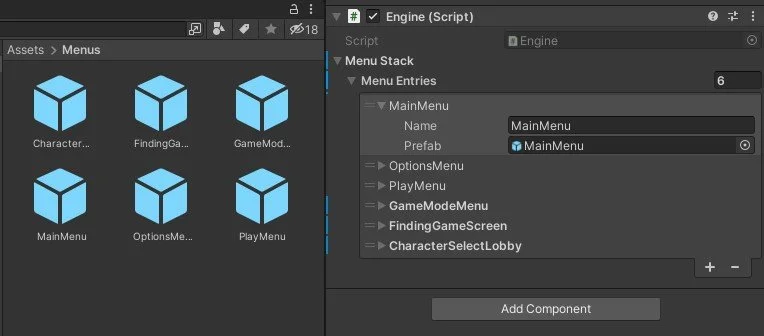 Each menu screen is built as a Prefab and added to this Menu Stack.